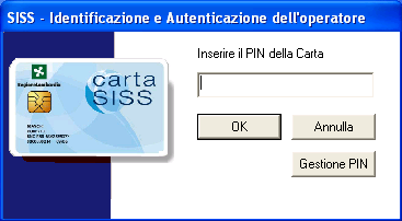 - Inserire la smart-card dell'operatore (medico) in uno dei lettori collegati al PC e digitare il PIN (Personal Identification Number) per accreditarsi al SISS
