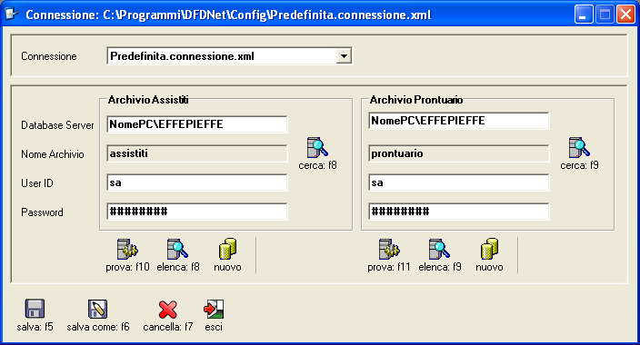 Il pulsante [salva come] permette di salvare il file di connessione su un file diverso da quello di partenza; il file di connessione originale viene preservato. I file di connessione vengono salvati nella cartella "C:\Programmi\DFDNet\Config", il programma aggiunge al nome indicato il suffisso ".connessione.xml".