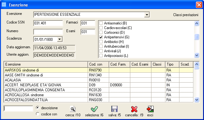 Per inserire una nuova esenzione premere il pulsante [esenzione: f3]; viene aperto il pannello mostrato qui sotto dove é possibile selezionare la nuova esenzione da associare all'assistito.