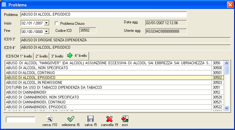 E' possibile effettuare la ricerca scorrendo la gerarchia della tabella ICD9-CM: una volta selezionata la riga interessata nella scheda di 1° livello si passa sulla scheda di 2° livello, nello stesso modo si passa in sequenza alla scheda di 3° e 4° livello, occorre selezionare infine la voce interessata e premere il pulsante [seleziona: f6] o il tasto [invio] in modo da valorizzare tutti i campi posti nella parte superiore del pannello (Problema, inizio, fine, ecc.).