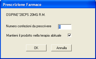 Premere [OK] per completare la prescrizione e tornare al Prontuario per prescrivere altri farmaci. Premendo [annulla] si torna al prontuario senza prescivere il farmaco. Una volta prescritti tutti i farmaci necessari premere [ESCI] per tornare alla scheda Terapia.