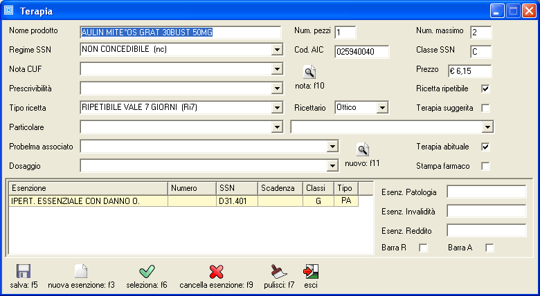 [verifica: F11] verifica le esenzioni impostate nella scheda Anagrafe - Esenzioni. Se i farmaci prescritti rientrano nelle categorie specificate come esenti vengono automaticamente marcati per l'esenzione.