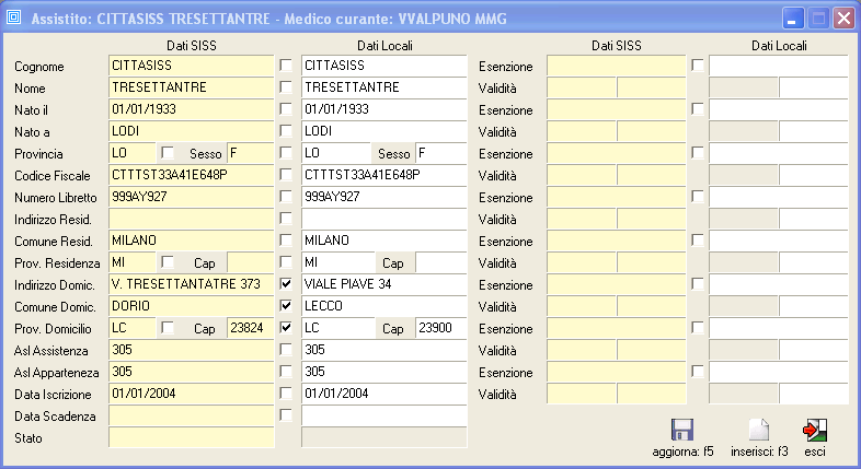 Al termine DFD.Net presenta il pannello di confronto (figura sotto) dove nelle colonne di sinistra sono mostrati in dettaglio i dati anagrafici e le eventuali esenzioni ricevuti dal SISS mentre, nelle colonna di destra, i dati presenti nell'archivio di DFD.Net afferenti allo stesso assistito. Nel caso in cui DFD.Net non sia riuscito a trovare l'assistito nel proprio archivio le colonne dei dati locali si presentano vuote.