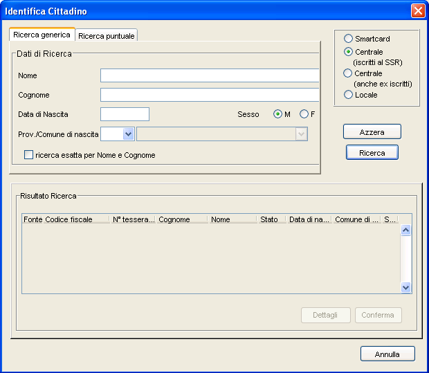 Indicare il nome e cognome del cittadino da ricercare negli appositi, campi, selezionare la ricerca nell'archivio "Centrale" del SISS e premere il pulsante [Ricerca] per avviare la ricerca.