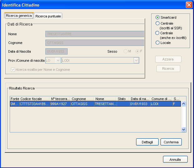 Nella figura qui sotto è mostrato l'esito positivo della ricerca, sia nel caso sia stata effettuata tramite la smartcard che tramite accesso all'anagrafe del SISS. A questo punto è possibile selezionare la persona trovata premendo il bottone [Conferma] oppure consultare in dettaglio di dati presenti nell'anagrafe premendo il bottone [Dettagli].