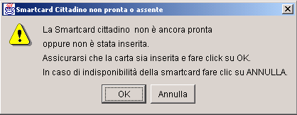 Nel caso in cui la carta del cittadino non fosse disponibile o non ne fosse possibile la lettura (scorretto inserimento nel lettore, lettore non collegato, carta rovinata, ecc.) viene mostrato il messaggio sotto riportato.