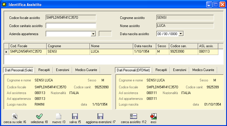 Con il pulsante [salva: f5] i dati dell'assistito in DFD.net vengono aggiornati con quelle ricevuti da SOLE; con il pulsante [aggiorna esenzioni: f7] vengono aggiornate le sole esenzioni senza modificare gli altri dati anagrafici.