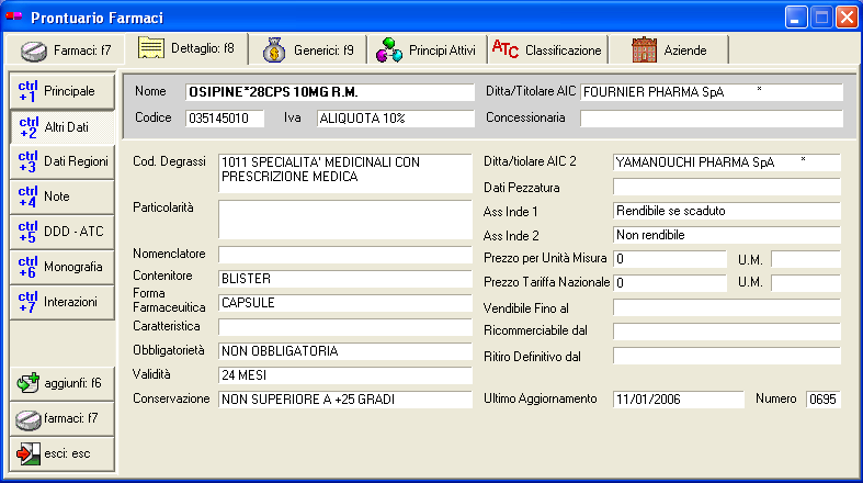 La scheda "Altri Dati" permette di consultare le informazioni aggiuntive del farmaco selezionato come mostrato in figura.