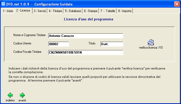 I dati della licenza d'uso del programma sono forniti unitamente al CD di installazione. Se si dispone solo di una versione dimostrativa del programma lasciare i dati "demo" proposti in automatico dal programma e mostrati qui sopra in figura.