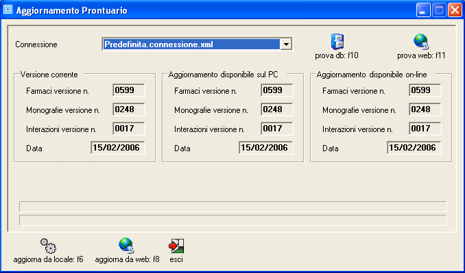 - Per ricevere gli aggiornamenti é necessario essere connessi ad internet. Premere il pulsante [prova web: F11] per verificare la connessione ad internet e al server di effepieffe; la corretta verifica della connessione mostra le ultime versioni degli aggiornamenti disponibili sul server per i farmaci, le monografie e le interazioni.