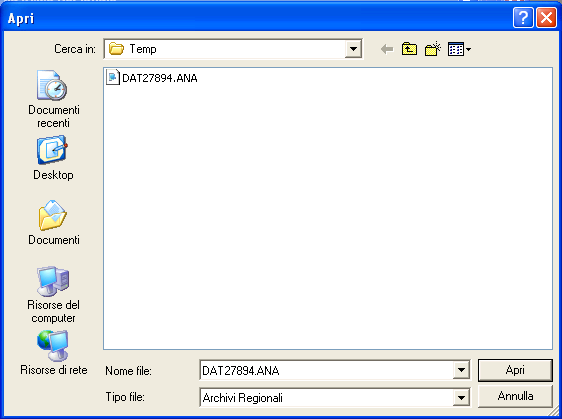 Una volta verificato il tracciato é possibile procedere all'importazione dei dati. Premere il pulsante [importa], si apre il pannello per la ricerca e la selezione del file da importare: selezionato il file premere il pulsante [Apri].