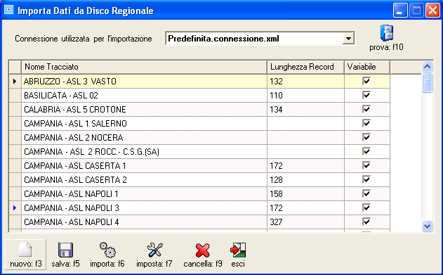 Il pannello presenta l'elenco dei tracciati dati regionali per l'importazione in DFD.Net delle anagrafiche degli assistiti. Dal pannello é possibile modificare l'impostazione dei tracciati, creare nuovi tracciati e avviare il processo d'importazione. Ogni regione, a volte ogni singola ASL, utilizza tracciati differenti per distribuire ai medici l'elenco dei loro assistiti.