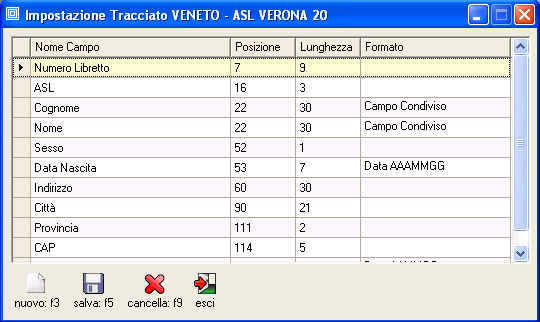 Posizione - indica la posizione di inizio del campo all'interno del tracciato regionale a partire dalla posizione 1 che indica il primo carattere del tracciato.