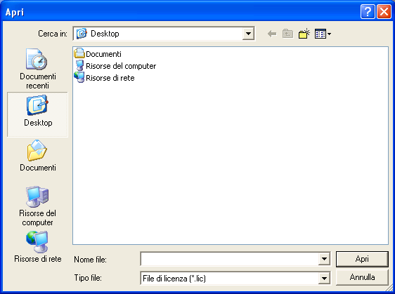 , viene richiamato il pannello per la ricerca sul proprio computer del file di licenza; una volta individuato e selezionato il file premere il pulsante [Apri] per procedere alla copia del file nella cartella "C:\Programmi\DFDNet\Config".