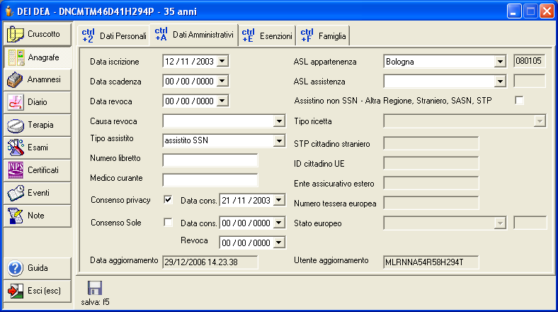 La scheda "Dati Amministrativi" permette la gestione dei dati amministrativi dell'assistito.