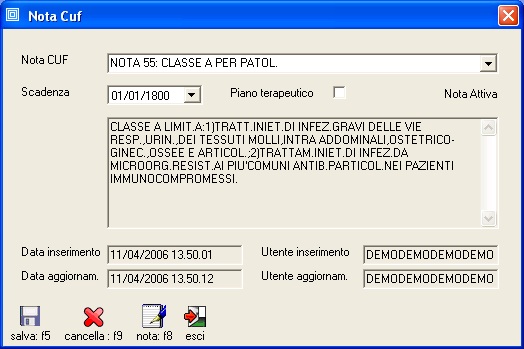 L'inserimento della nota CUF nel fascicolo dell'assistito permette di automatizzare il controllo della prescrivibilità dei farmaci: quando viene inserito nella terapia abituale un nuovo farmaco sul quale é attiva una nota CUF il programma verifica se nel fascicolo é presente la nota, in caso negativo viene dato un avviso e richiesta una conferma di prescrivibilità del farmaco, in caso positivo il farmaco viene inserito in terapia senza alcun messaggio. Questa regola di comportamento della nota CUF può essere attivata/disattivata nella scheda "Farmaci" del pannello "parametri generali": se la regola é disattivata il programma non effettua nessun controllo.