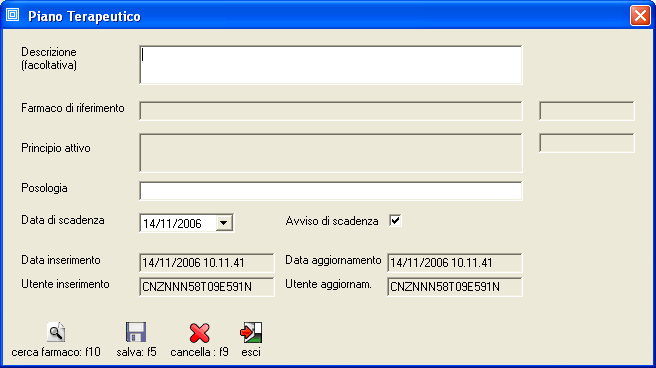 Per inserire nella cartella un nuovo piano terapeutico premere il pulsante [piano terapeutico: f7].