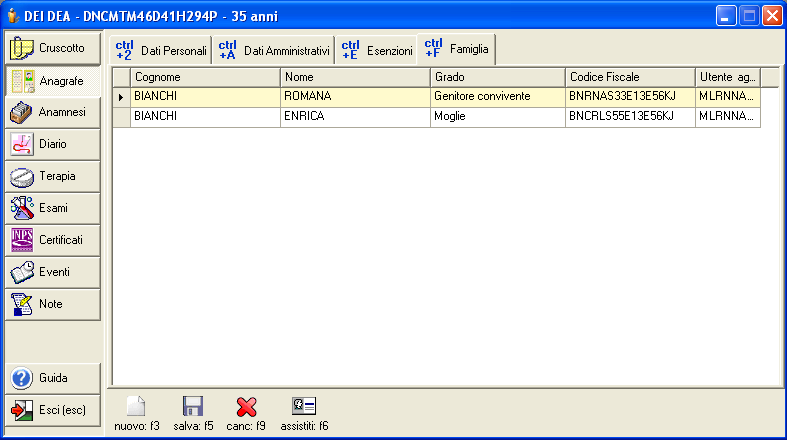 Per facilitare l'attività di inserimento del nucleo é possibile ricercare i familiari dall'elenco degli assistiti presenti nell'archivio: premere il pulsante [assistiti: f6] per aprire l'elenco, ricercare e fare doppio clic sul nome del familiare per inserirlo nella scheda.
