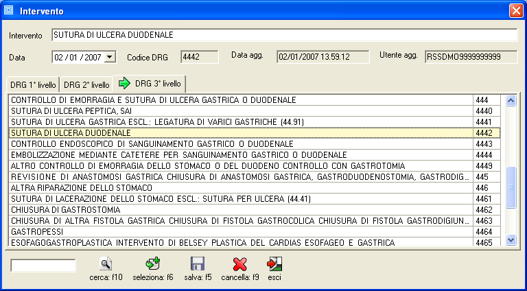 La selezione dell'intervento all'interno della classificazione DRG può essere effettuata con le stesse modalità indicate per la ricerca dei problemi all'interno della classificazione ICD9-CM.