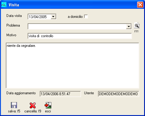 Per inserire una nuova visita premere il pulsante [nuovo: F3]; viene aperto il pannello mostrato qui sotto dove é possibile inserire il motivo ed i dettagli della visita.