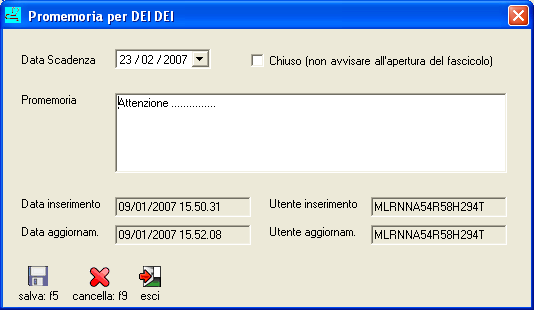Per inserire un nuovo promemoria premere il pulsate [nuovo: f3], indicare la data di scadenza, scrivere il messaggio del promemoria e premere il pulsate [salva: f5]