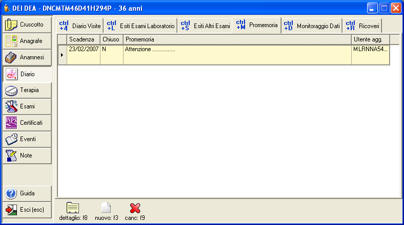 La scheda "promemoria" permette di gestire la visualizzazione di promemoria legati all'assistito. All'apertura deI fascicolo dell'assistito il programma mostra un avviso con il promemoria attivo. L'avviso viene visualizzato a partire da un mese prima dalla data di scadenza. Gli avvisi sono mostrati fin quando il promemoria non viene chiuso o cancellato.