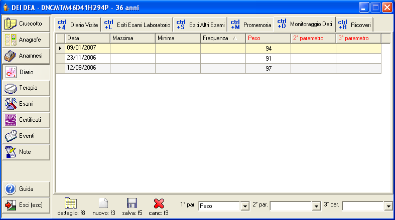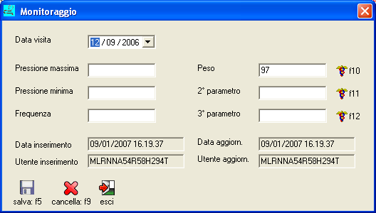 Per inserire una nuova visita di monitoraggio premere il pulsante "nuovo: f3" quindi inserire nel pannello di dettaglio i valori di monitoraggio e premere "salva: f5"
