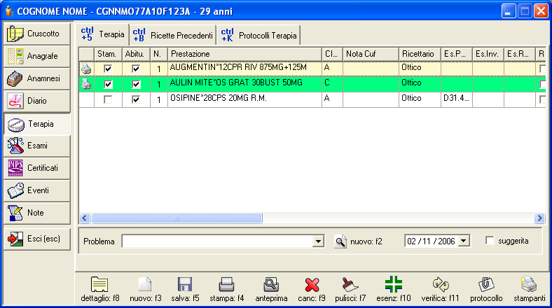 [verifica: F11] verifica le esenzioni impostate nella scheda Anagrafe - Esenzioni. Se i farmaci prescritti rientrano nelle categorie specificate come esenti vengono automaticamente marcati per l'esenzione.