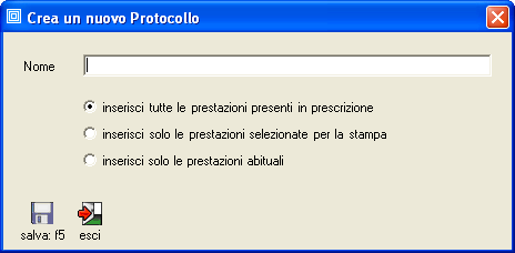 premendo il pulsante [protocollo] nella scheda Terapia si apre la maschera Crea un nuovo protocollo