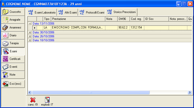 Nella scheda Storico Prescrizioni č possibile vedere l'elenco delle prescrizioni fatte in precedenza al paziente, raggruppate e ordinate in base alla data.