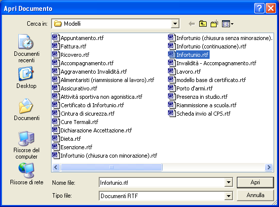 Selezionare il modello adeguato e premere [APRI]. Viene visualizzato a questo punto il certificato precompliato in tutti i suoi campi fondamentali (dati del medico, dati del paziente, date, ecc...)