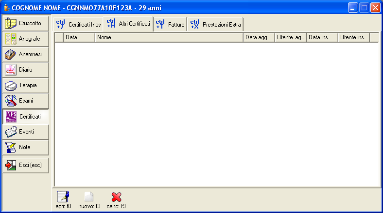 La scheda Altri Certificati permette di visualizzare e all'occorrenza modificare o ristampare i certificati non INPS rilasciati in precedenza al paziente, oppure di crearne uno nuovo.